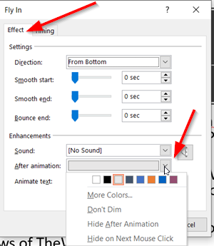 切换到“效果(Effect)”选项卡。在那里,您应该会看到默认选中的“不要变暗”选项(在“(Don’t Dim)动画后(After Animation)”选项旁边)。